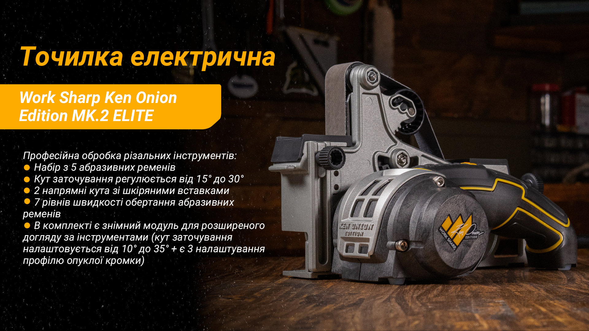- Комплектація: Точилка Work Sharp Ken Onion Edition MK.2 ELITE, точильна касета, комплект з 5 абразивних ременів, знімний модуль для розширеного догляду за інструментами