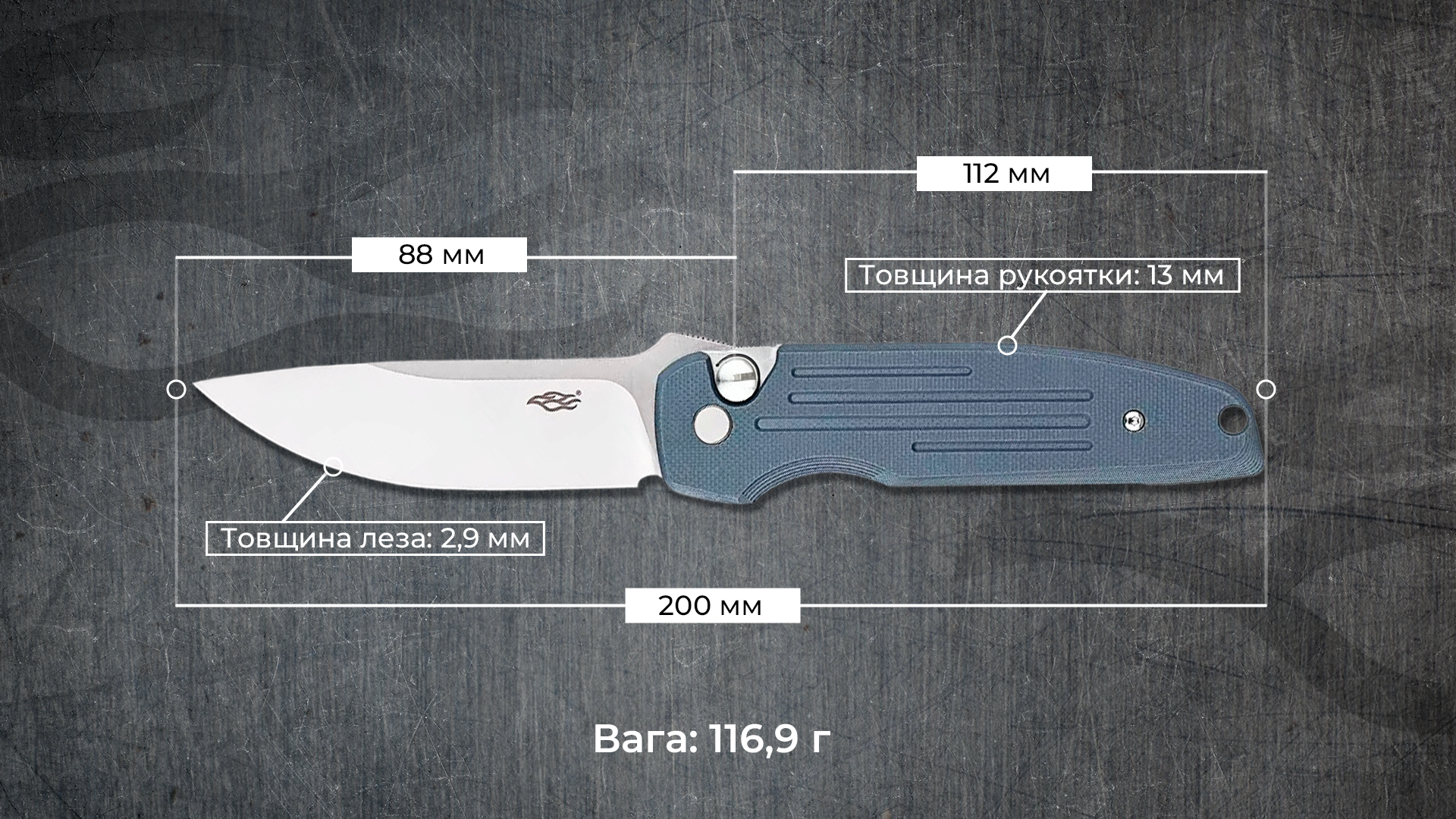 - Склопластикові накладки на руківʼї. Композит G10 відрізняється високою стійкістю до механічного впливу та вологи. Матеріал не тріскається у разі падіння ножа, не деформується під час температурних коливань, а також не вбирає воду та запахи. До того ж текстурована поверхня плашок покращує зчеплення з долонею.