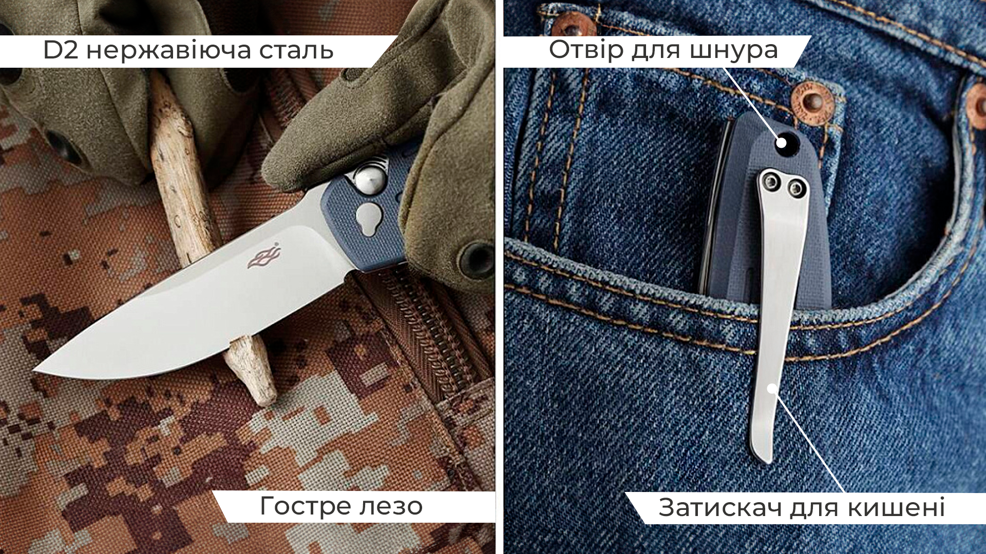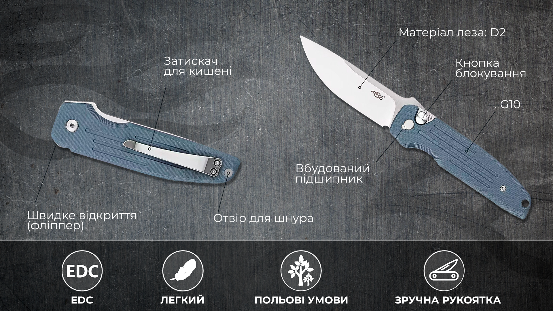З урахуванням ваги, що дорівнює 116 г, ніж Firebird FH926 зберігає головну перевагу складаних інструментів — зручність у транспортуванні. Ви можете носити модель у місті, брати її на риболовлю, полювання чи в подорож. Достатньо закріпити конструкцію на кишені за допомогою тугої кліпси.