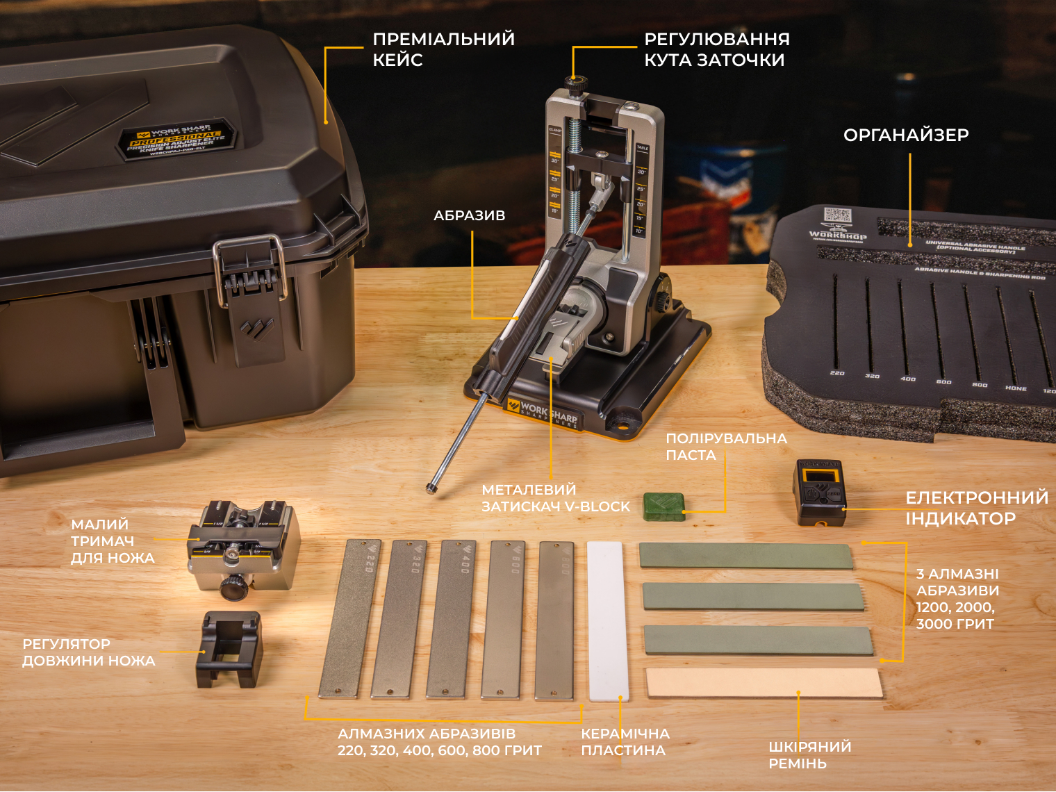 - у комплекті є цифровий індикатор кута, платформа для малих ножів та жорсткий футляр для зберігання.