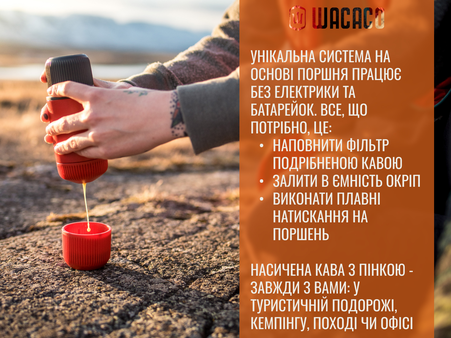 Кавоварка Wacaco Nanopresso — це практичний помічник для тих, хто не хоче відмовлятися від запашної кави в будь-яких умовах. Модель є компактною альтернативою домашнім кавомашинам, пропонуючи швидке приготування еспресо, де б ви не знаходилися: у туристичній подорожі, кемпінгу чи поході. Пристрій також можна використовувати в офісі та вдома, експериментуючи з дозуванням кави, температурою води та швидкістю проливу завдяки ручному керуванню.