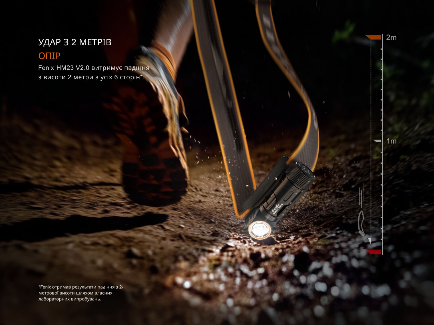 Компактні розміри 73.6 х 36 х 30 мм і вага лише 86.3 г разом з батареєю роблять HM23 V2.0 невідчутним на голові та зручним у носінні. Алюмінієвий корпус та лінза з полікарбонату витримують повсякденні навантаження, зокрема падіння з висоти 2 м.