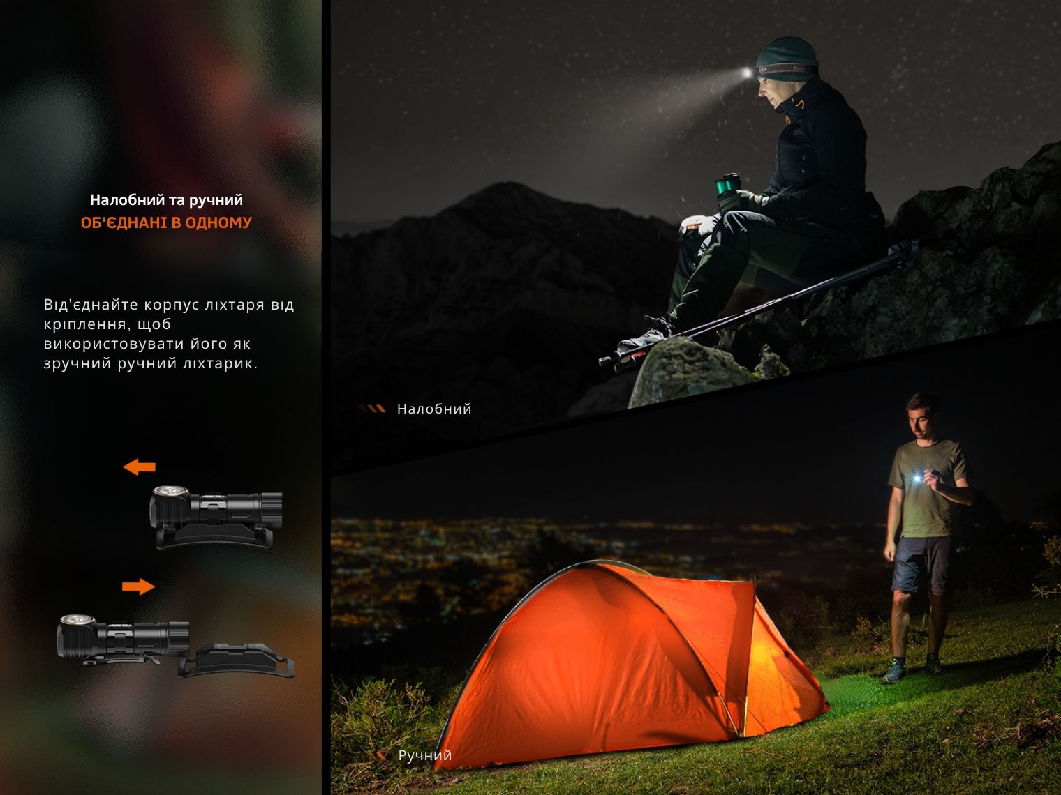 Одна з особливостей моделі — універсальна конструкція. Ви можете носити ліхтар на голові або касці, знімати корпус з кріплення та використовувати його як ручний ліхтарик, кріпити на кишеню або фіксувати на металевій поверхні завдяки магніту у хвості.