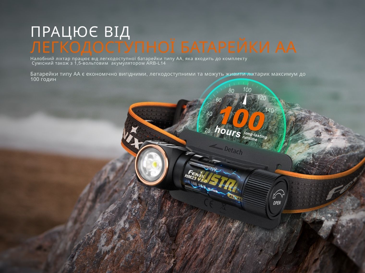 HM23 V2.0 живиться від однієї батареї AA, яка йде у комплекті. Ліхтар також сумісний з перезаряджуваним акумулятором Fenix ARB-L14-U типорозміру 14500 (1.5 В).