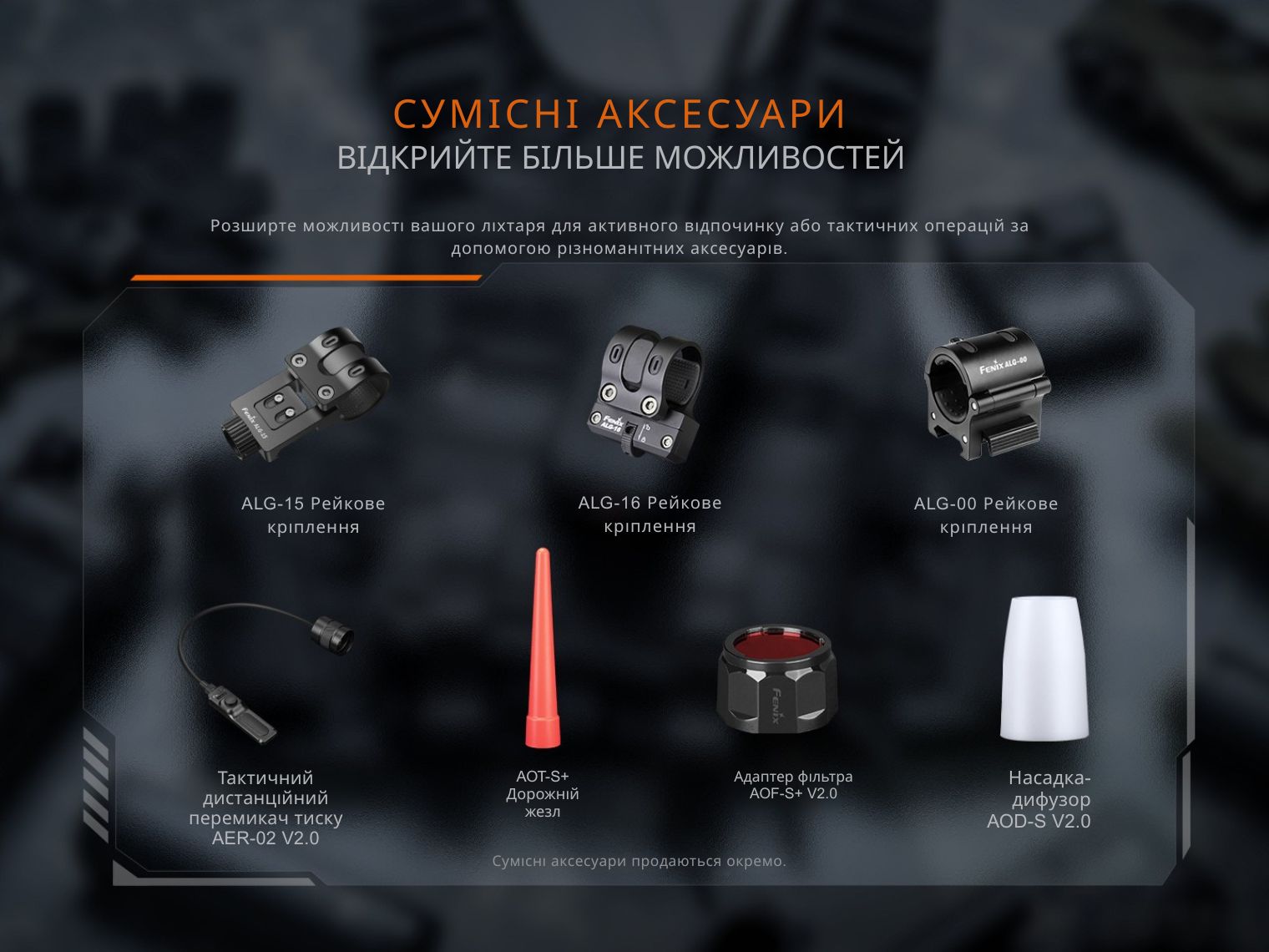 Ви можете розширити функціонал ліхтаря за допомогою додаткових аксесуарів: кріплень на зброю ALG-00, ALG-15, ALG-16, виносної кнопки AER-02 V2.0, світлофільтра AOF-S+ V2.0, дифузійного фільтра AOD-S V2.0 і сигнального жезла AOT-S+.