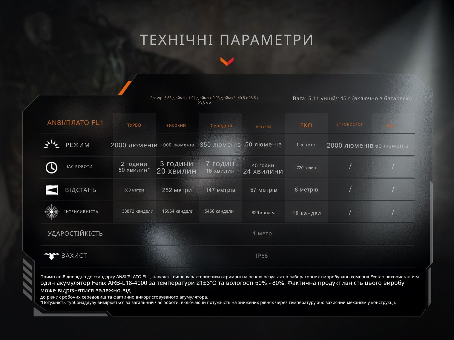 - Турбо: 2000 лм – 33872 кд – 2 год 50 хв – 380 м;