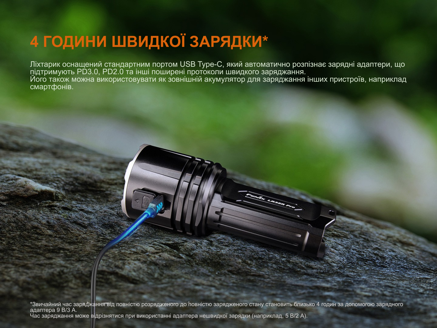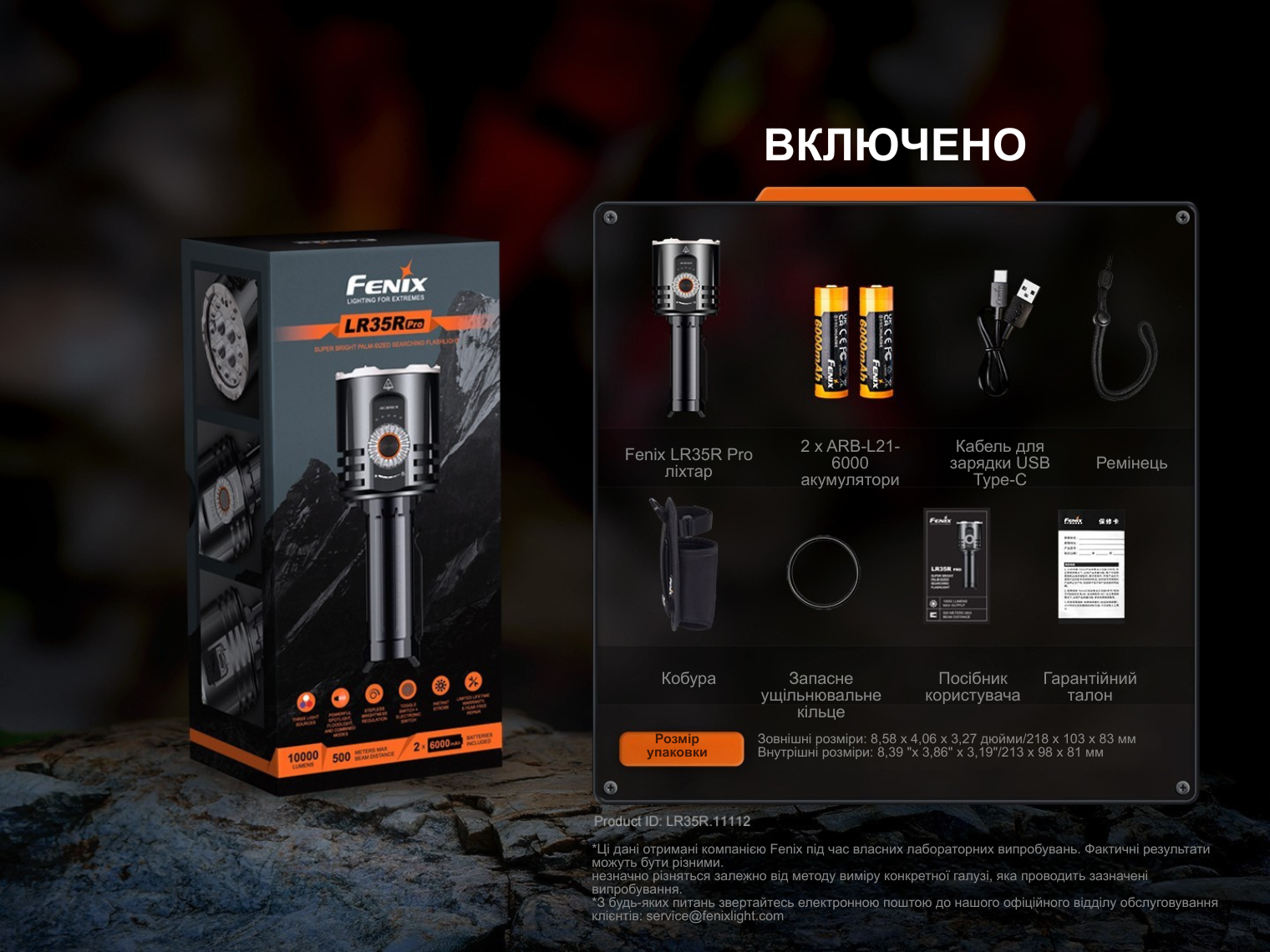 Ліхтар Fenix LR35R PRO з кліпсою, 2 х акумулятори 21700, зарядний кабель USB-C, запасне ущільнювальне кільце, темляк, чохол, інструкція користувача, гарантійний талон.