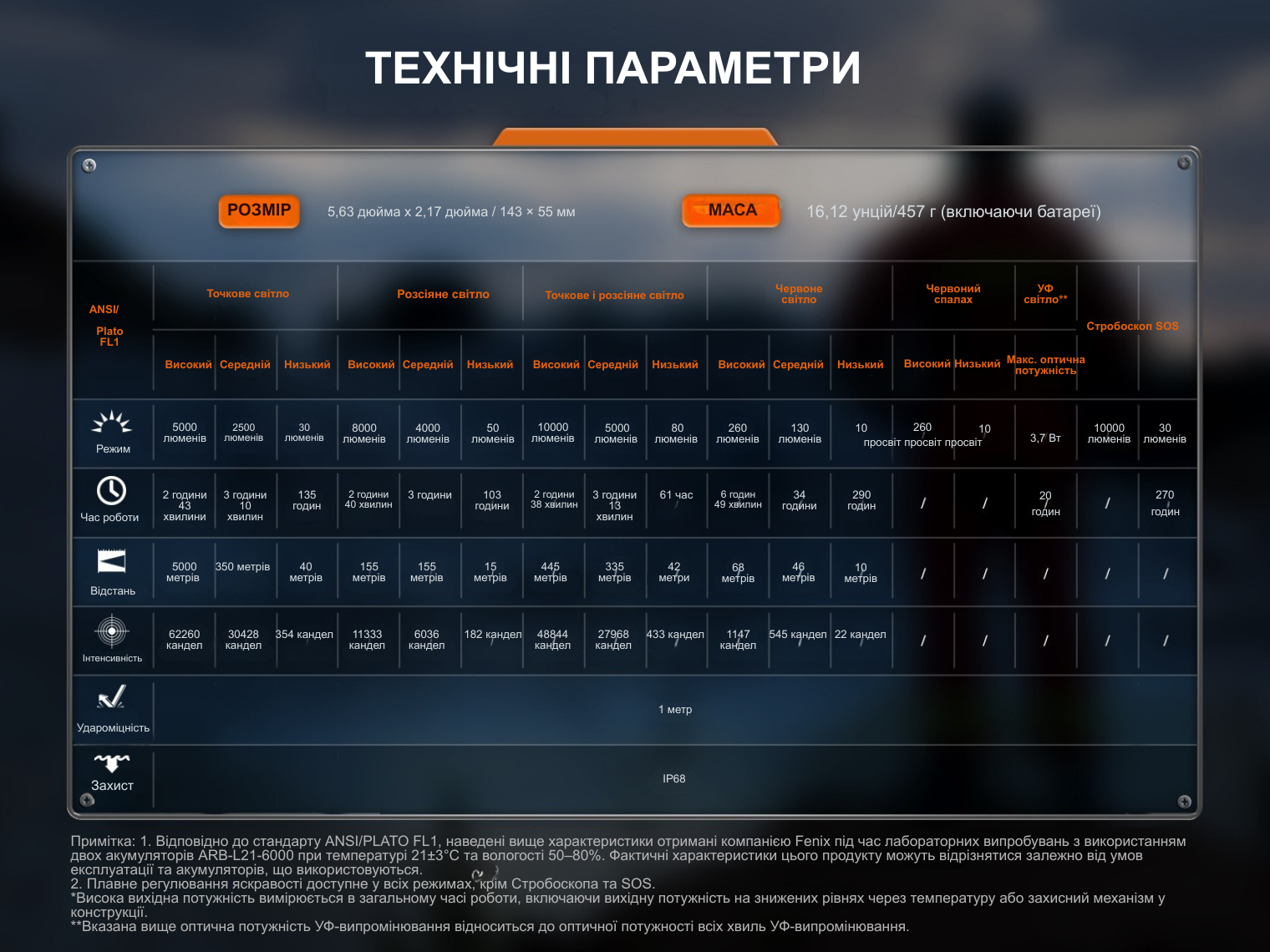 - Середній: 5000 лм – 27968 кд – 3 год 13 хв – 335 м;